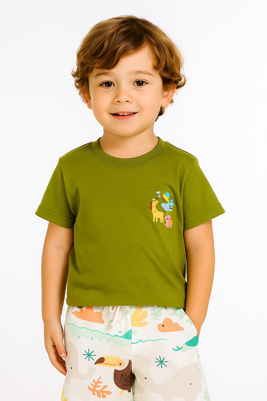 Com camiseta verde em malha supermacia e uma bermuda estampada com animais e folhagens, esse look traz leveza, alegria e conforto — perfeito para crianças cheias de imaginação.