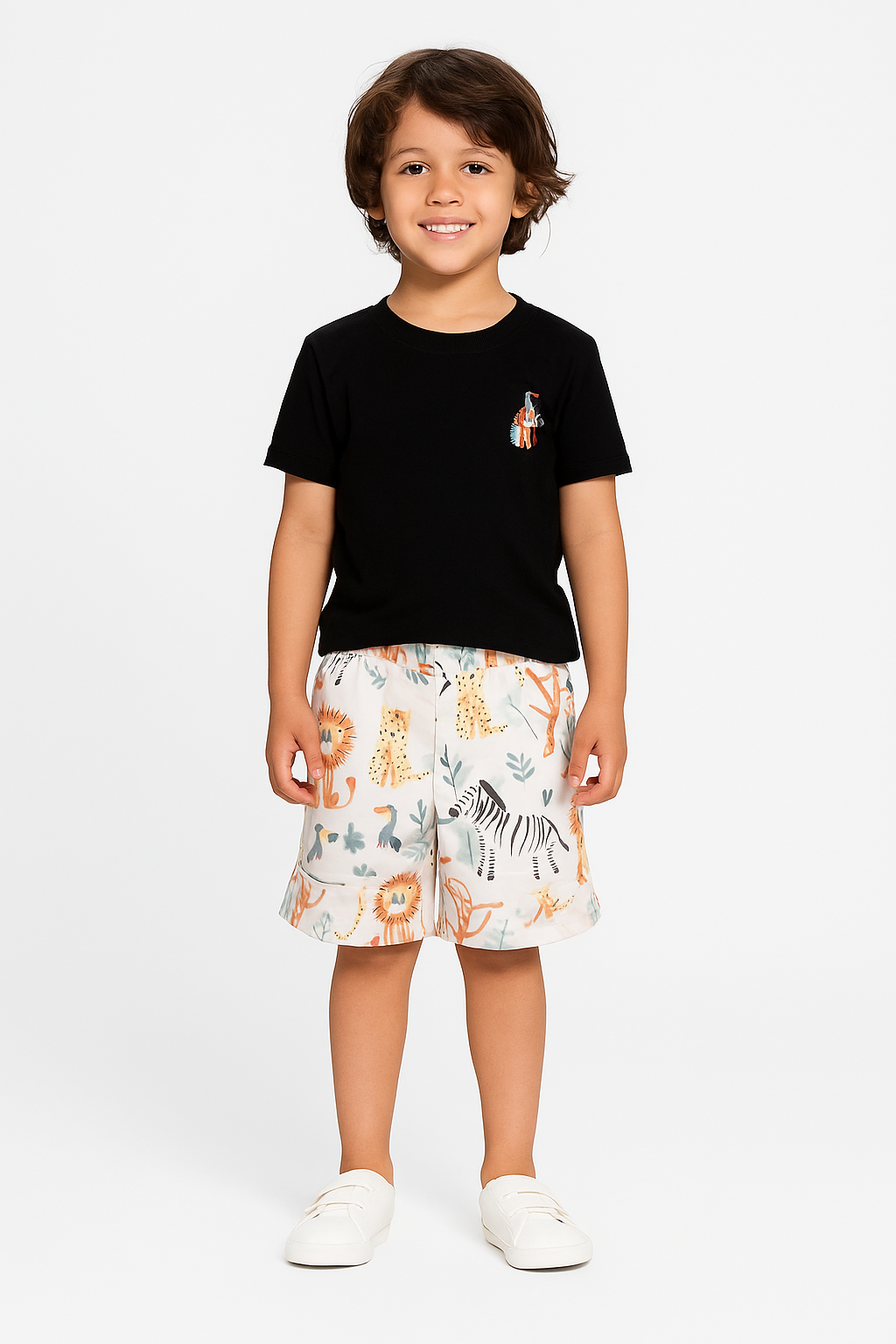 A camiseta preta, macia e superconfortável, possui um pequeno bordado temático que deixa o look ainda mais especial. A bermuda estampada traz leões, zebras, macacos e elementos da natureza — uma explosão de fofura e personalidade!
