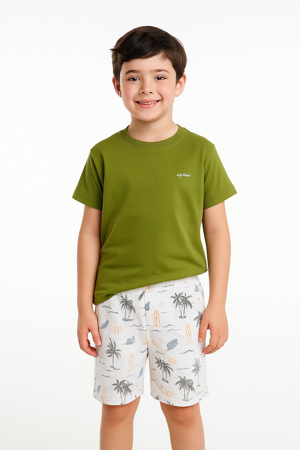 A camiseta verde oliva é super macia, respirável e possui caimento perfeito. Já a bermuda branca traz uma estampa praia & surf moderna, com coqueiros, pranchas e elementos tropicais — leve, divertida e a cara do verão!